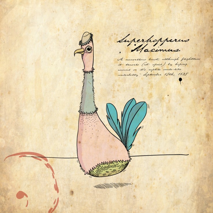 Superhopperus Maximus – An amazing beast that although flightless, travels (at incredible speed) by hopping on its reptile-scale like underbelly.