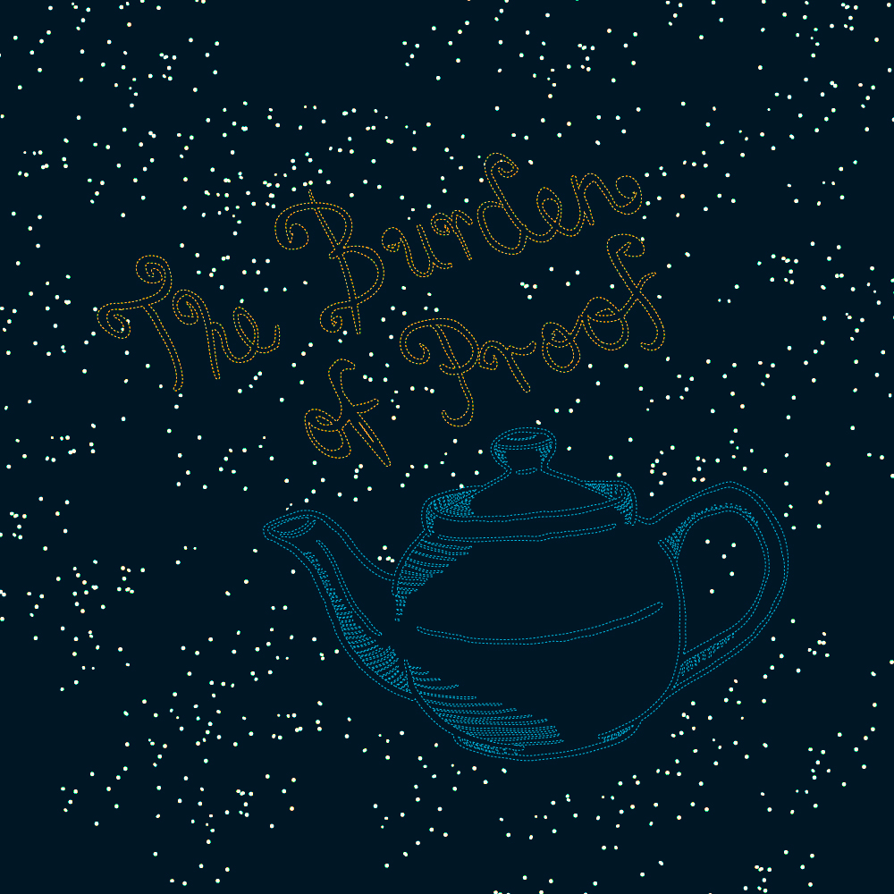 Today’s image is a tip of the hat to one of my favourite philosophers and all round nice guy Bertrand Russell. The burden of proof, some will tell you rests with those denying another’s claim of something that cannot be proven by measurable means. Mr Russell demonstrated through a lovely little analogy that the opposite is the case: