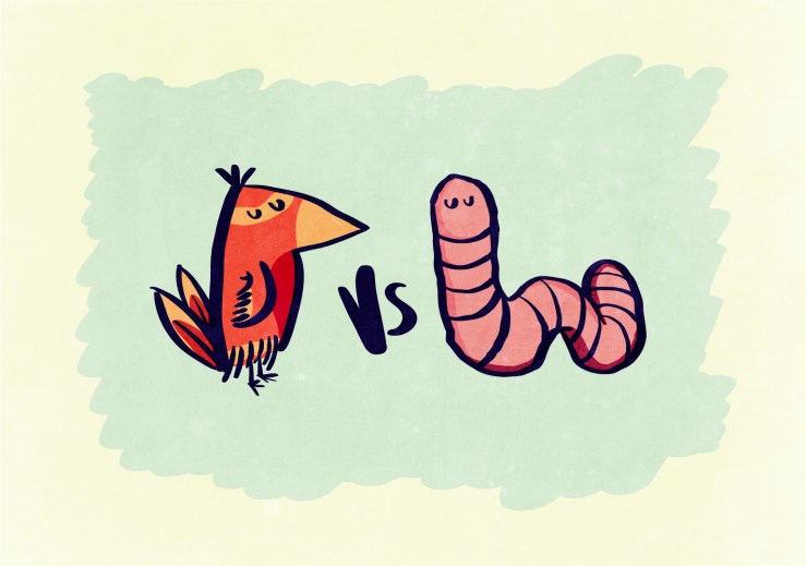 BIRD VS WORM was born from my doodling of a range of characters that I’m going to paint on to Piper’s chest of drawers in her room. Now, the characters themselves are probably a little boring but when pitted against each in other in battle? Well…. I think I hear a new series theme coming on!