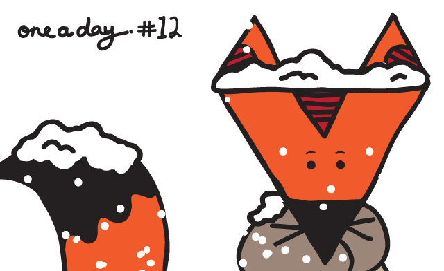 So here I was, wondering how I’ll top Gorilla Sugar Skull as I really think it’s my best ‘One a Day’ so far… To be honest it was struggle street in coming up with something so I thought I’d draw a picture of the next song that came on my iTunes. Thank Sausage Jesus that the song was White Winter Hymnal by Fleet Foxes, a lovely little folk song about children’s heads falling off in the snow! For some reason, I always picture a little fox (I wonder why?!) wearing a little jacket and scarf walking through the snow. So there you have it, my drawing of a little fox in the snow brought to you by the letter F and the band Fleet Foxes.